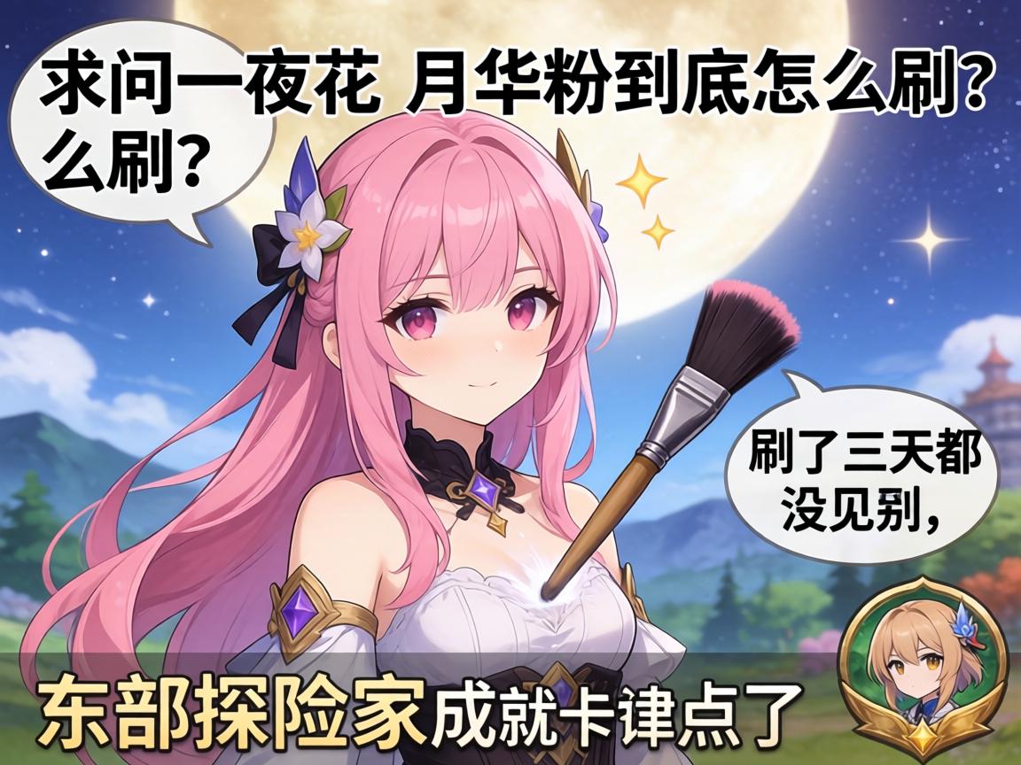 最近在冲东部探险家成就,其他特产好歹有地图提示或者固定点位,但一夜花的月华粉简直阴间。我一开始以为满月夜晚随便逛逛就能撞见,结果在沙原和森林来回跑了十几次,毛都没有。后来看攻略才知道,这东西不仅需要丰饶期+满月夜晚,还得靠概率刷新,地图上连个提示图标都不给,纯靠肉眼扫荡。