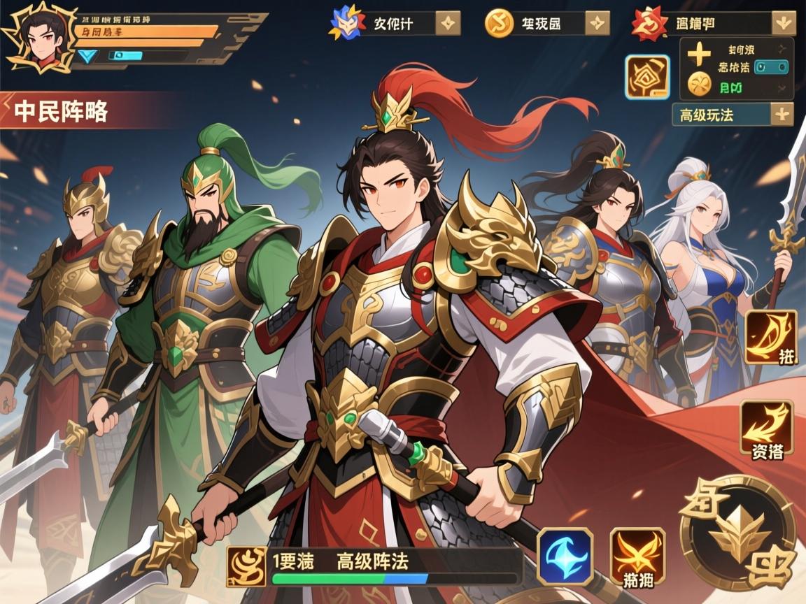 阵容搭配是游戏的核心策略点,一个好的阵容往往能让你以弱胜强。游戏中武将分为不同职业:谋士(策略输出)、飞将(物理输出)、虎卫(前排坦克)、方士(辅助)和先锋(能抗能打)。你需要根据他们的定位进行布阵,例如通常将虎卫放置在前排承受伤害。