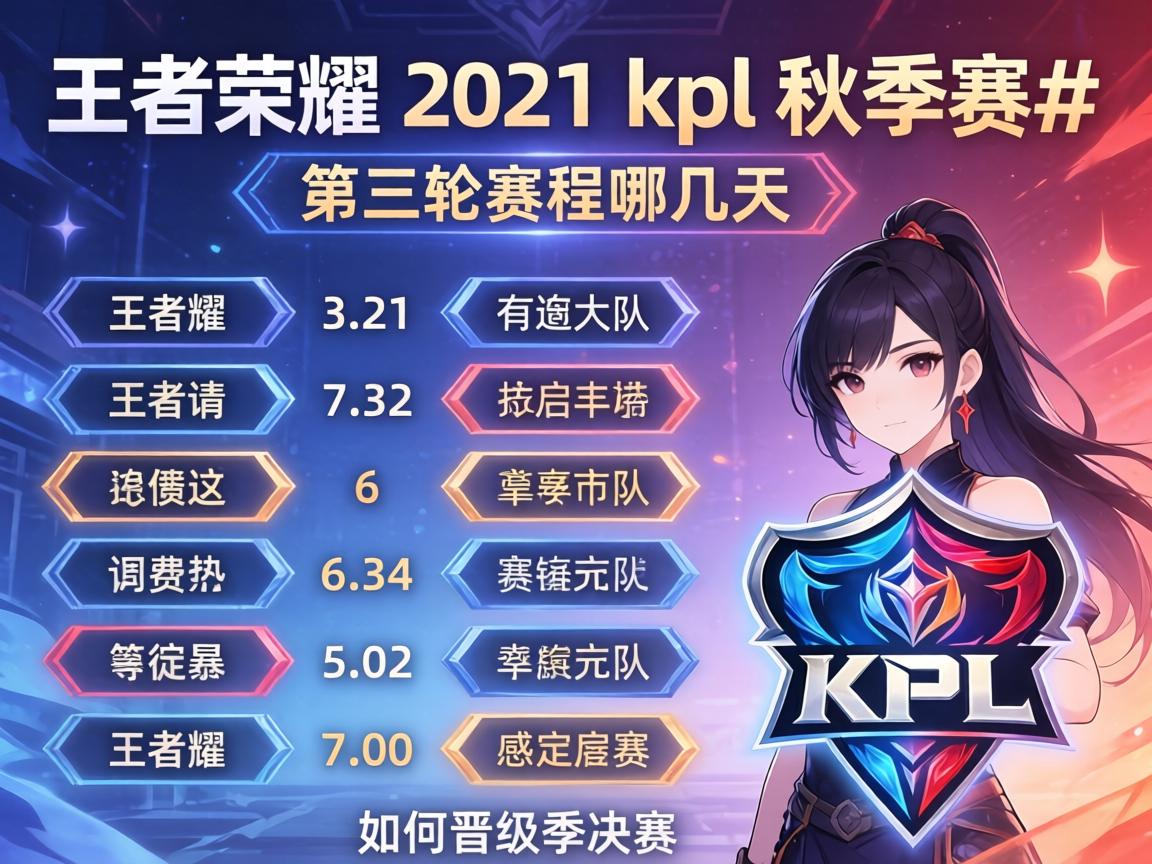 各位王者荣耀的玩家们,大家好!我是资深KPL赛事分析师,多年来专注于研究KPL赛事体系与战队战术动向。很多玩家在回顾或了解2021年KPL秋季赛第三轮赛事时,都想清晰知道其具体赛程、参赛战队以及关键的晋级规则。今天,博主就为大家系统梳理一下这段赛事的详情,希望能帮到你。