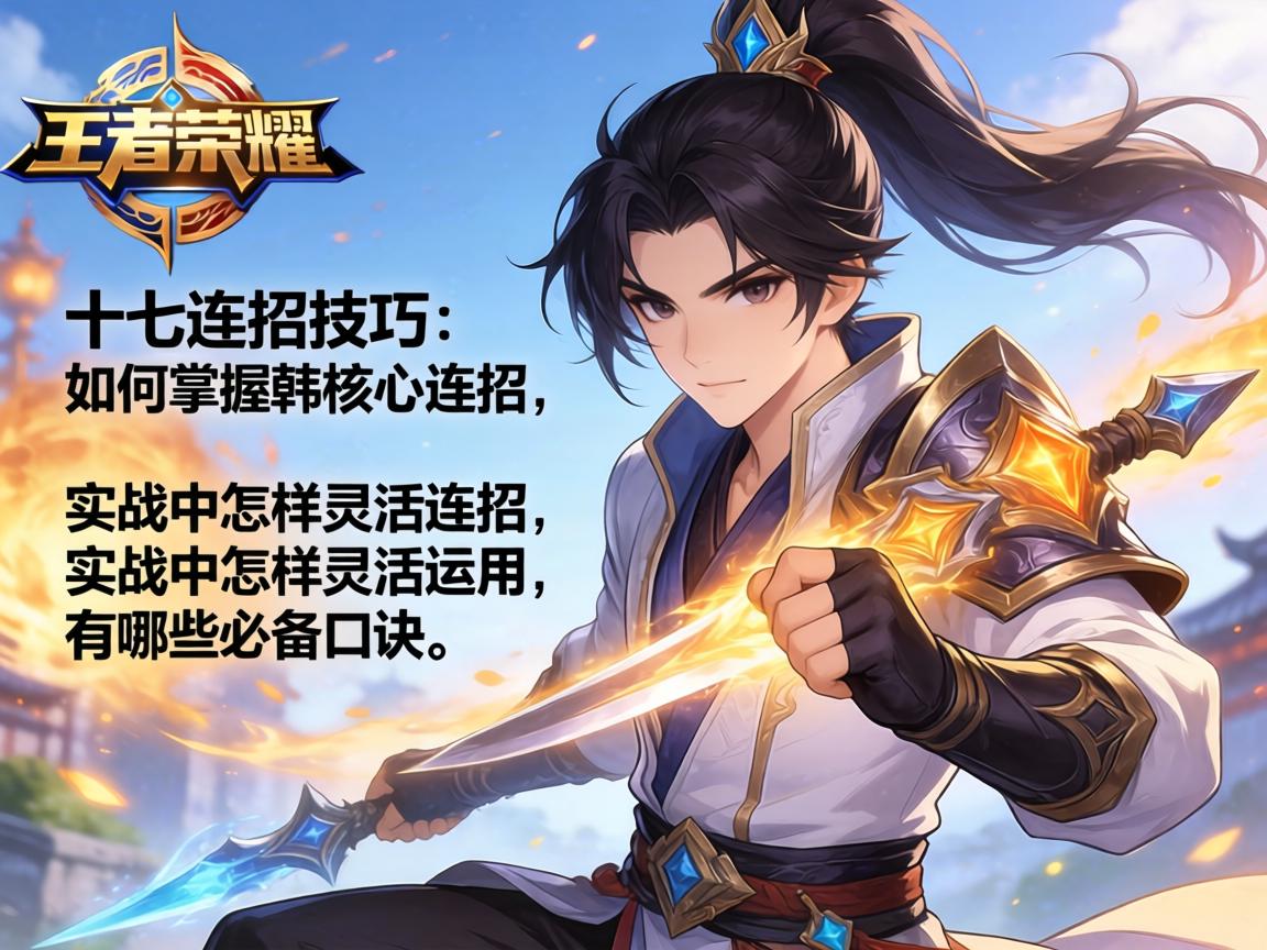 基于十七的教学,韩信有一套相对固定的连招套路,但需要根据战况灵活调整。基础连招为2-1-3:反向2技能+平A+1技能(第一次击飞)+A+大招(第二次击飞)+A+第二段1技能+A(被动第四次普攻击飞)。
