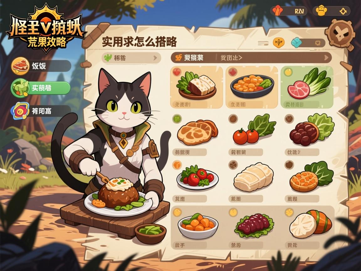 我先说啊,猫饭可不是随便吃吃就完事的。游戏里主要食材分三大类:兽肉套餐加50生命和150体力,还带30分钟攻击+2;渔获料理同样加50生命和150耐力,提供防御+4;野菜组合则是生命耐力都加,额外给防御+2和全属性抗性+3。但很多人忽略了追加食材和调味食材,这两个才是决定餐点技能的关键。比如绵绵蛋能随机提升攻击力,西尔德大蒜能让你一次不被猫车,这些效果实战中特别实用。